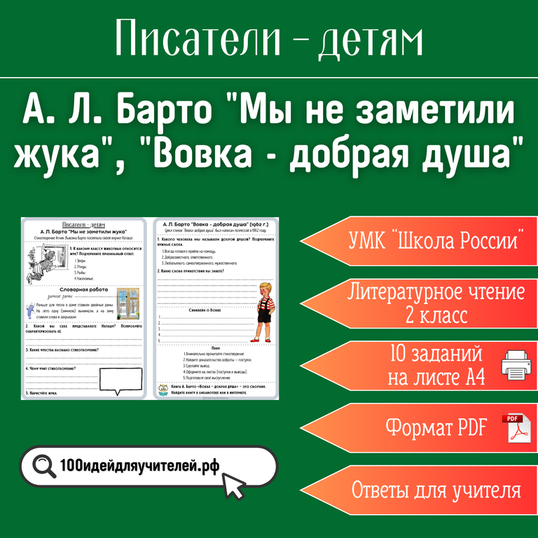 цифровой товар цифровой товар Рабочий лист. 2 класс. А. Л. Барто "Мы не заметили жука...", "Вовка - добрая душа". Раздел "Писатели - детям" 50 ₽ В КОРЗИНУ В КОРЗИНУ Поделиться