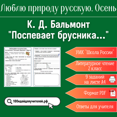 цифровой товар цифровой товар Рабочий лист. 2 класс. К. Д. Бальмонт "Поспевает брусника...". Раздел "Люблю природу русскую. Осень" 50 ₽ В КОРЗИНУ В КОРЗИНУ Поделиться
